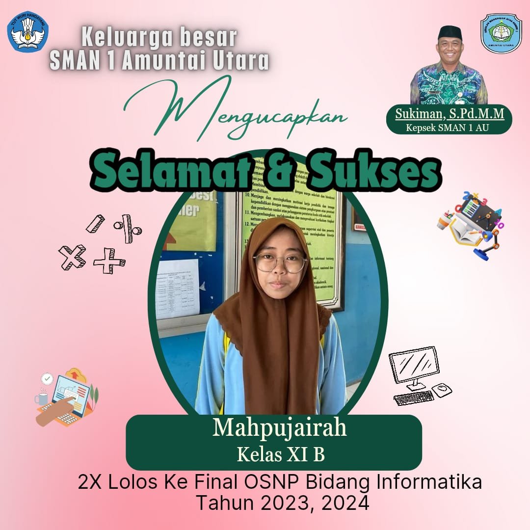 Untuk kedua kalinya siswa SMAN 1 Amuntai Utara yang berhasil meraih nilai passing grade nasional untuk ke tingkat provinsi yaitu Mahpujairah dari kelas XI B mendapat peringkat 4 bidang Informatika.
